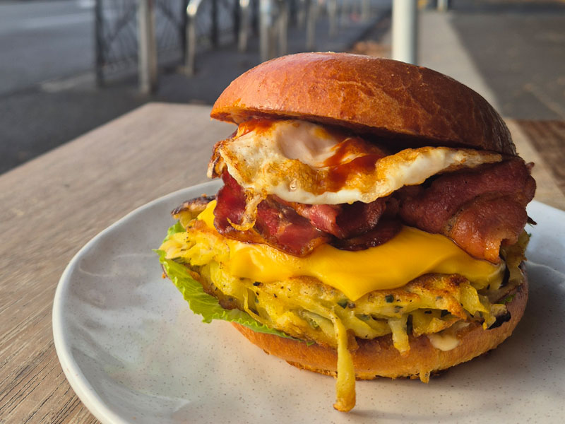 Toasted Brioche buns with Housemade Potato, Onion and Herb Hashbrown, Fried Egg, Cheese, Crispy Bacon, Lettuce, Aioli and BBQ sauce. Yum!