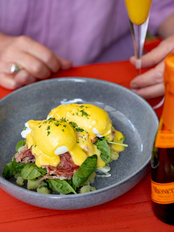 The dish will be served with a Mimosa or another hot drink of your choice.
