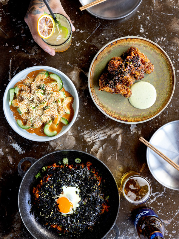 Select either our crispy eggplant or nom nom chicken. Accompanied by oi cucumber and kimchi fried rice.