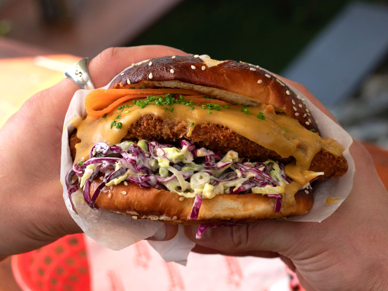 Our Japanese style katsu chicken curry burger is loaded with fried katsu chicken breast, Japanese curry sauce, fresh Yuzu slaw and pickled carrot in a signature Parade house-made pretzel bun.
