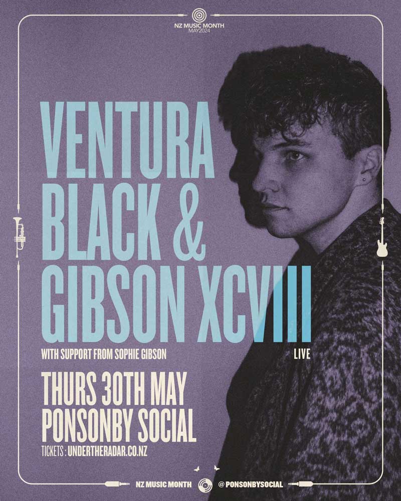 Join Ventura Black & GIBSON XCVIII as they celebrate Pop music in Aotearoa for NZ Music Month through catchy hooks, infectious melodies and driving kick drums at Ponsonby Social Clubs accompanied by special guest opener Sophie Gibson, this is an electric show not to be missed!