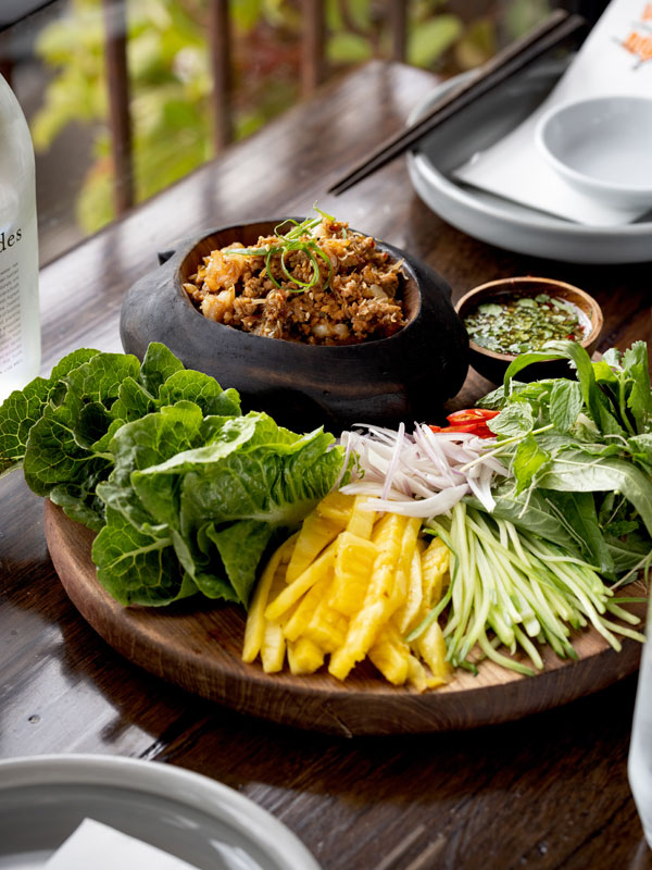 Pork and Prawn San Choy Bau, cooked Blue Breeze style – lettuce leaves, pineapple, cucumber, chilli, coriander, herbs and tamarind and palm sugar dressing.