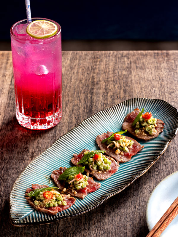Thinly sliced beef cooked in lemon and served with capsicum, beans, lemongrass and fermented fish sauce. Choose either our hale’s syrup soda or a glass of house red or white wine to go with your snack.